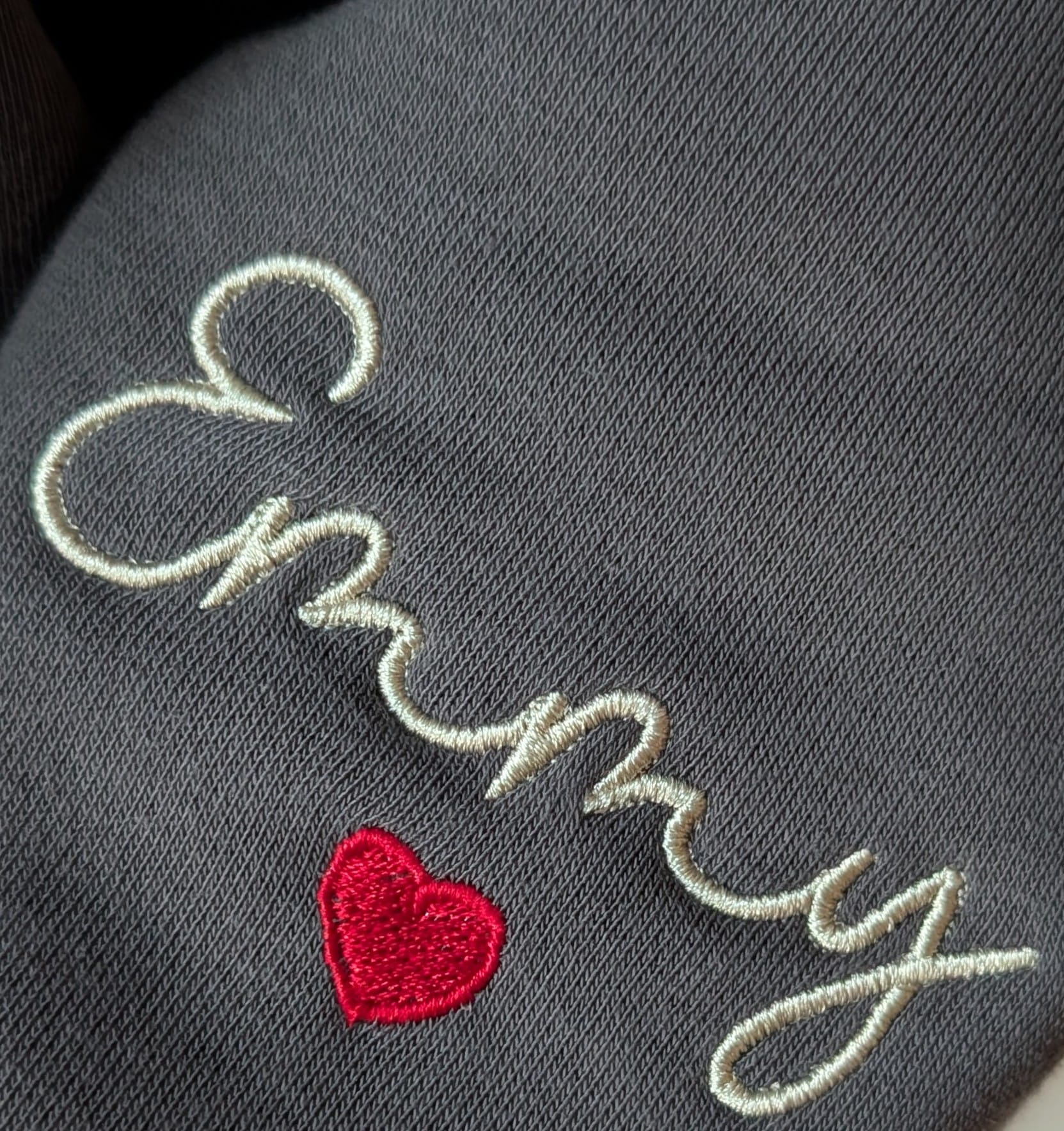 Machine embroidered dog mum sweatshirt with dog’s name and heart embroidered onto sleeve. Perfect for Birthdays, Christmas, Valentines and Mother’s Day.